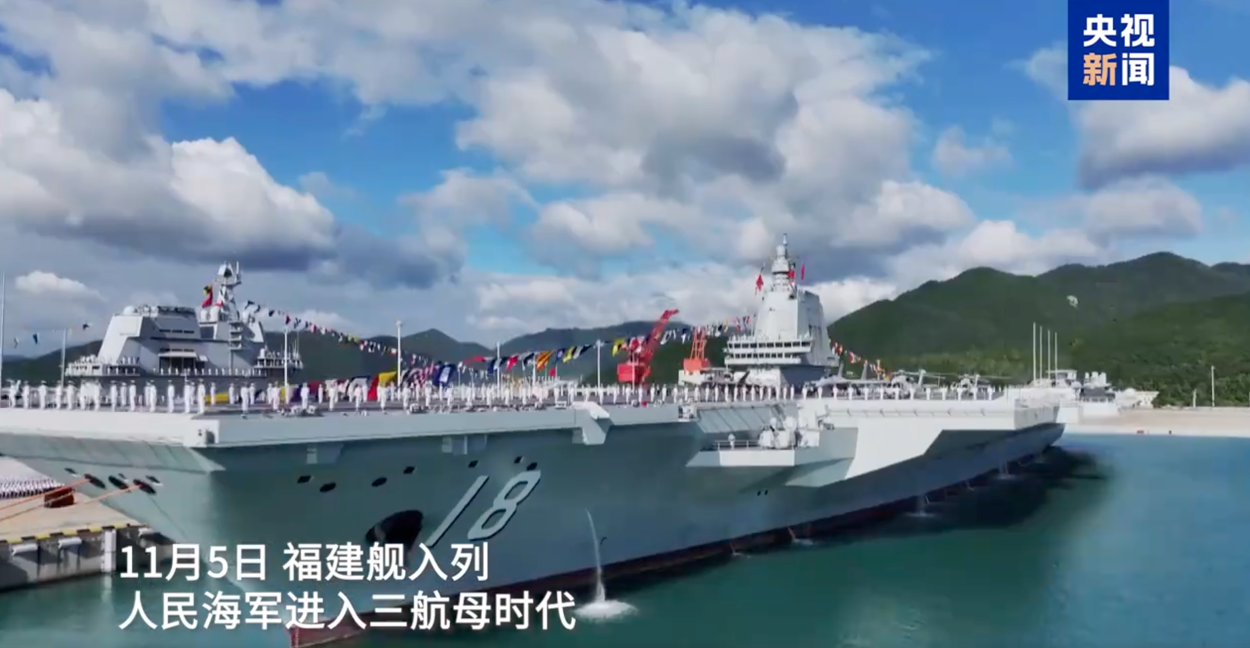 11月5日,我国第一艘电磁弹射型航空母舰福建舰入列授旗仪式在海南三亚某军港举行,福建舰入列,标志着我国人民海军进入三航母时代!